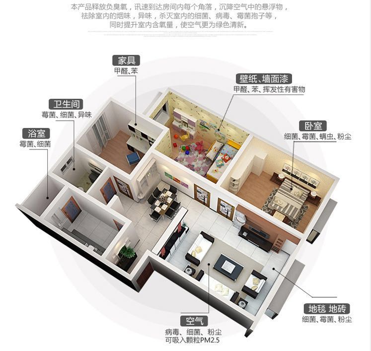 除甲醛公式:1HCHO(甲醛)+2O3=1CO2+1H2O+2O2 2HCHO(甲醛)+2O3=2CO2+2H2O+1O2 5O3+C6H6(苯)=6CO2+3H2O